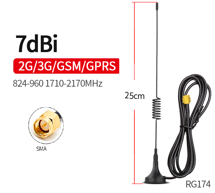 Antenna NameGSM 2 Spring Sucker AntennaModel No.KX-XPGSM9Length Total31CMGain10DBIConnectorSMA Male PinCable Length1M/3M/Customized